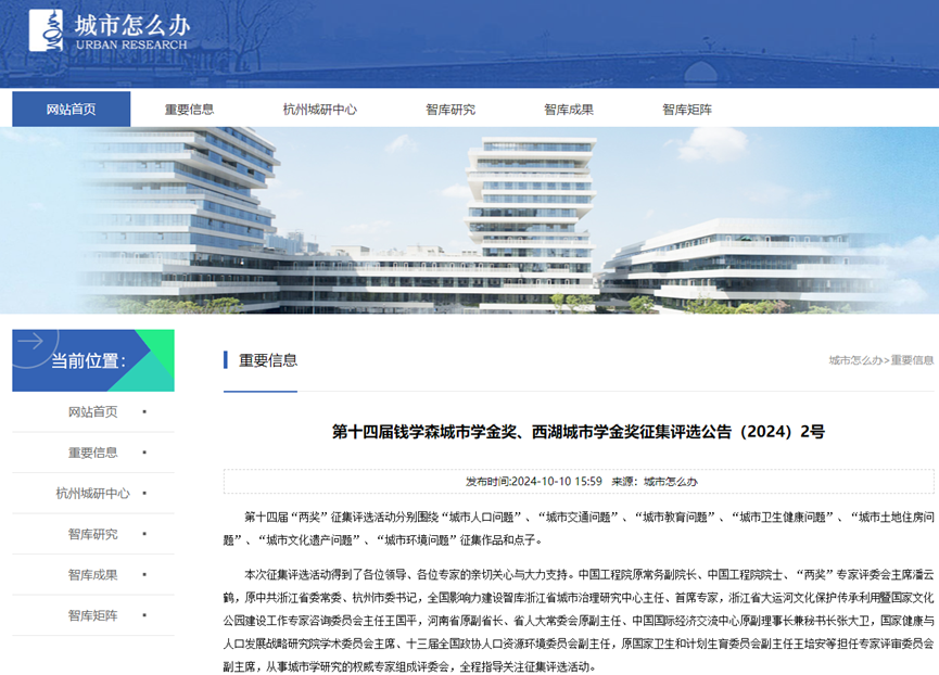“钱学森城市学金奖”是全国第一个综合性的城市学领域最高学术奖项,是由杭州国际城市学研究中心发起,联合相关权威学术机构共同组织的学术评审活动。钱学森先生是城市学的倡导者,开辟了以系统论统领城市研究的全新领域。为纪念钱学森先生在城市学领域的开创性贡献,弘扬钱学森城市学研究的理念与方法,推进新时代城市学研究,特开展钱学森城市学金奖征集评选活动。据悉,第十四届“两奖”征集评选活动分别围绕“城市人口问题”“城市交通问题”“城市教育问题”“城市卫生健康问题”“城市土地住房问题”“城市文化遗产问题”“城市环境问题”征集作品和点子。组织者对征集作品经过初选、初评、通讯评审、集中评审和复核审定5个环节,全过程匿名评审,保持评审的公平公正。