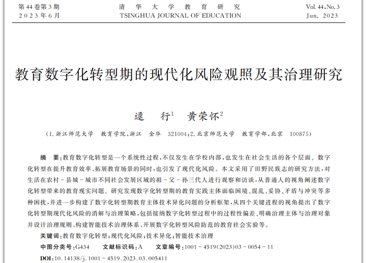 摘要:教育数字化转型是一个系统性过程,不仅发生在学校内部,也发生在社会生活的各个层面。数字化转型在提升教育效率、拓展教育场景的同时,也引发了现代化风险。本文采用了田野民族志的研究方法,对生活在农村-县城-城市不同社会发展区域的祖-父-孙三代人进行观察和访谈,从普通人的视角阐述数字化转型带来的教育现实问题。研究发现数字化转型期的教育实践主体面临困境、混乱、妥协、矛盾与冲突等多种困扰,并进一步构建了数字化转型期教育主体技术异化问题的分析框架,从四个关键进程的视角提出了数字化转型期现代化风险的消解与治理策略,包括接纳数字化转型过程中的过程性偏差、明确治理主体与治理对象并设计治理规则、构建智能技术治理体系、开展数字化转型风险防范的教育社会实验等。