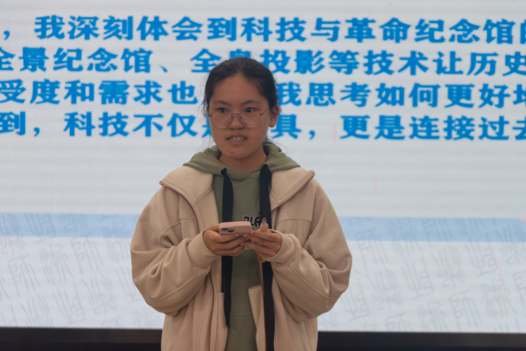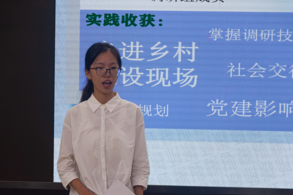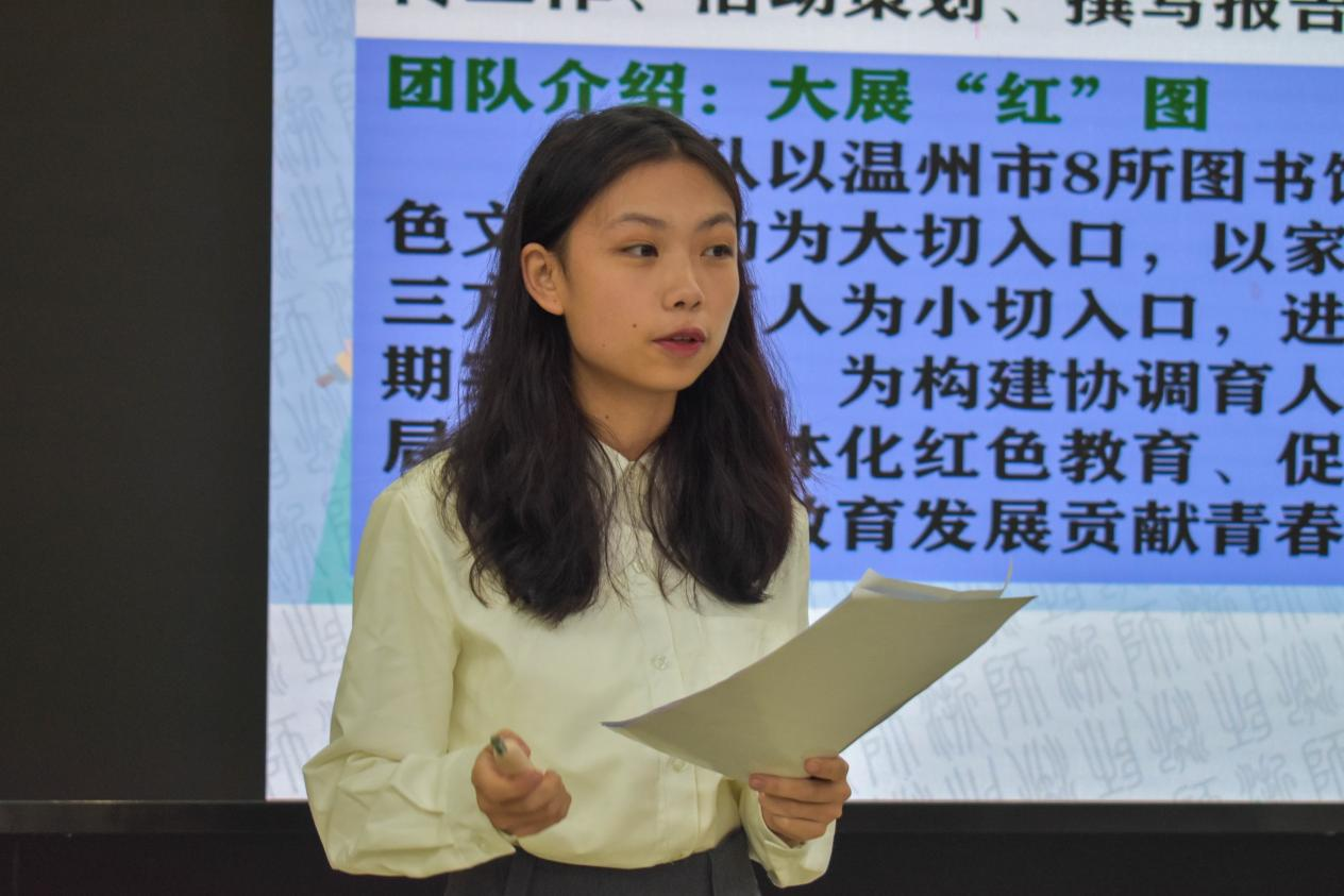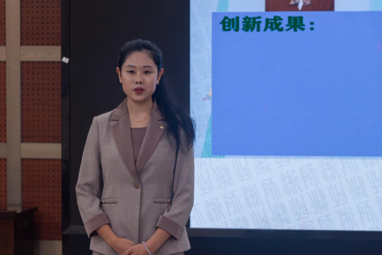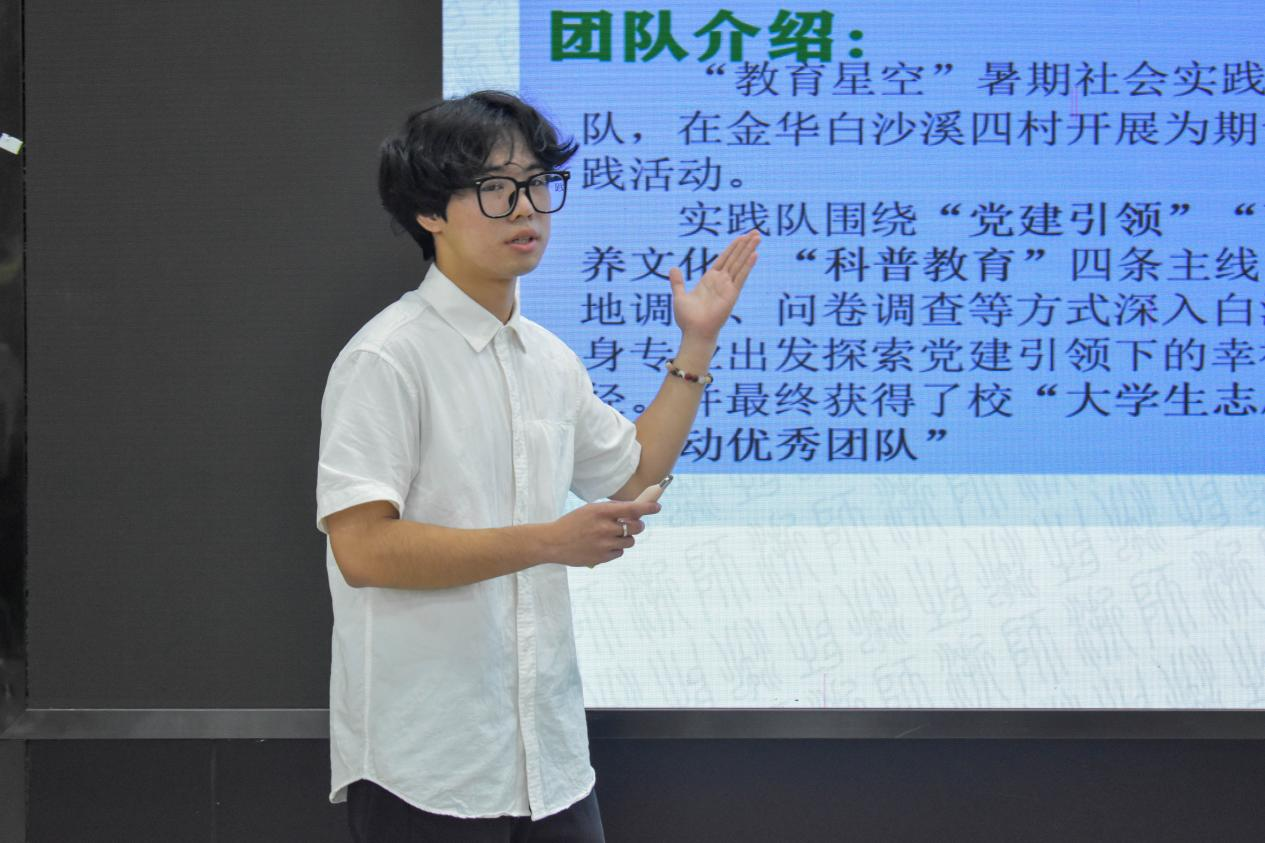 首先进行的是先进个人实践成果展示环节。着眼党建引领下“生态+康养+科教”三位一体幸福乡里建设新模式,刘艺轩同学围绕“宣传”的真正意义,接地气、个性化、落实处地宣传了党对乡里建设的创新模式;驻足数字化时代下“瓯越手工非遗”文化传承路径,张郡同学通过调查研究与实地探访,将非遗文化传承融入小学教育专业中,有效促进了瓯越文化传承与创新。