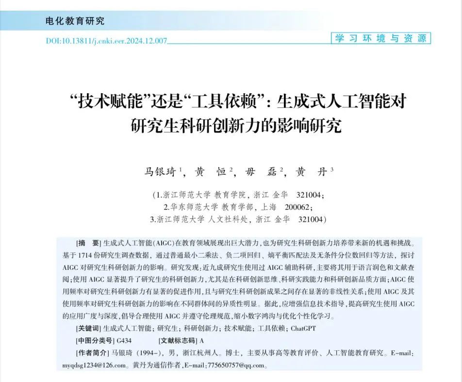 近日,KY开元集团青年教师马银琦及其团队在一级期刊《电化教育研究》2024年第12期发表《“技术赋能”还是“工具依赖”:生成式人工智能对研究生科研创新力的影响研究》。在智慧信息技术迅猛发展的时代,生成式人工智能(AIGC)正逐渐渗透到各个领域,从商业广告到医疗诊断,再到学术研究,AIGC的应用日益广泛,特别是在教育和科研领域,AIGC展现出了极大的潜力,研究生作为科研创新的生力军,其科研创新力的培养对整个科学技术的发展和社会进步至关重要。在此背景下,文章基于1714份研究生调查数据,采用普通最小二乘法,负二项回归,熵平衡匹配法及无条件分位数回归等方法,探讨AIGC对研究生科研创新力的影响,为研究生科研创新力的培养提供实证依据,从而推动AIGC技术在高等教育领域中的优化应用。