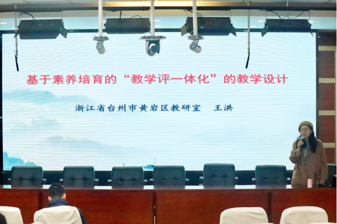 12月11日,浙江省正高级教师、黄岩区教研室教研员、台州市名师王洪于17幢112报告厅作题为“基于核心素养培育的‘教学评一体化’的教学设计”的讲座,120余位师生参加,教务办主任闫伟主持。