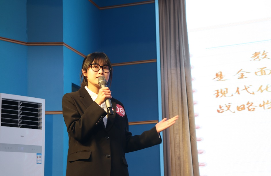 决赛分为“思政知识竞赛”与“大学生讲思政课”两大环节,充分考察参赛选手掌握思政理论知识的水平,以及运用马克思主义立场、观点、方法分析问题的能力。在“思政知识竞赛”环节,教育学院的选手们面对快问快答与抢答的激烈对抗,以扎实的理论功底和敏捷的反应速度,成功解答一道道难题,获得了该环节第一名的好成绩。在“大学生讲思政课”环节,教育学院陈洁同学以丰富的知识储备和生动的讲述方式,将思政课的理论精髓与“浙江师范大学研究生支教团”的实践案例巧妙融合,为观众带来了一场精彩的思政课堂。