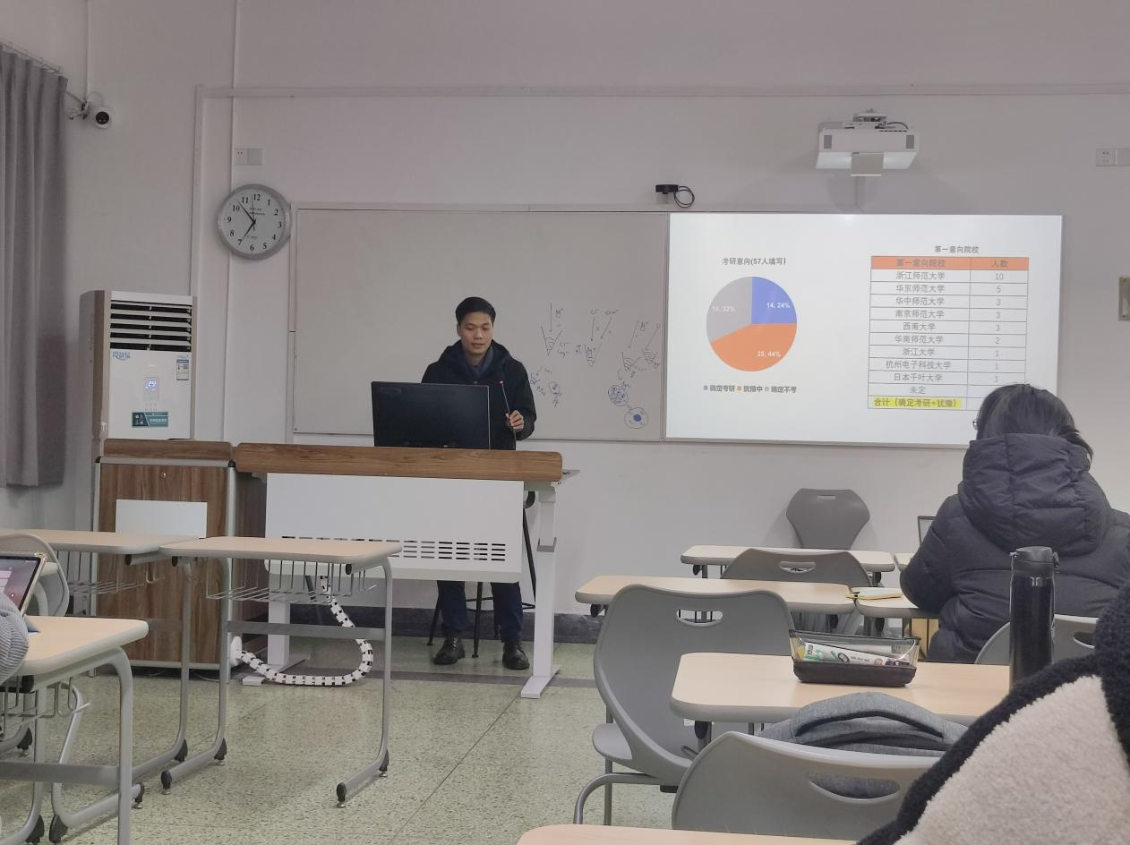 两位班主任对班级同学考研意向进行了摸底调查,建议有考研意向的同学们提前做好调研,结合个人所长确定目标院校,早做规划和准备。两位老师还分享了自己择校与备考的经验供同学们参考。