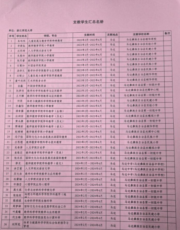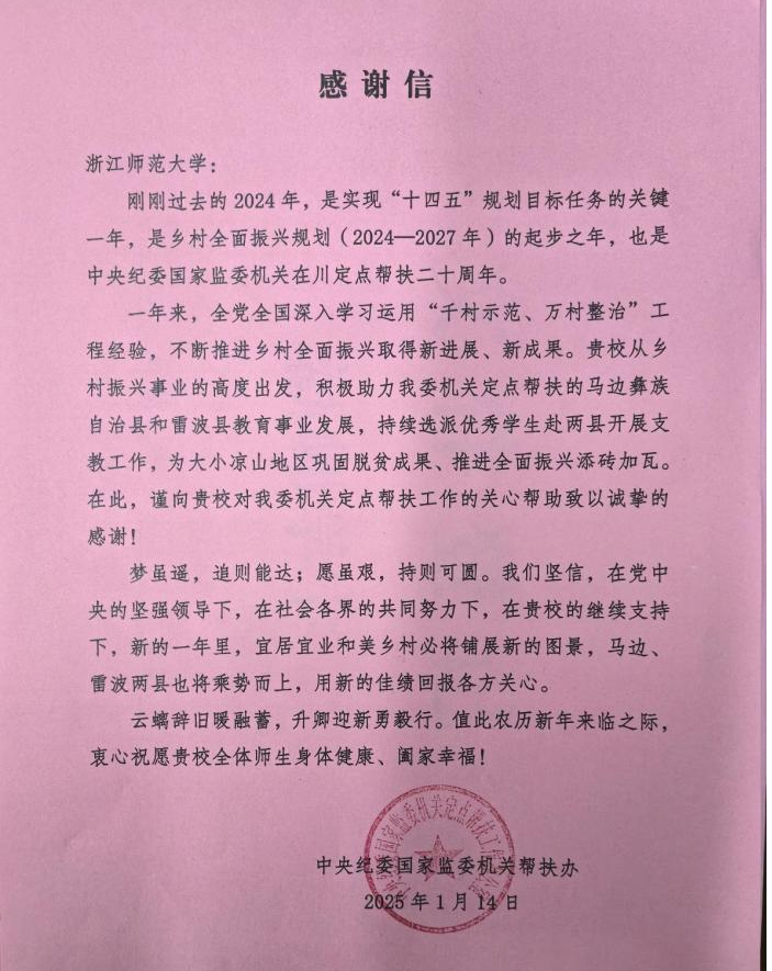 近日,一封来自中央纪委国家监委机关帮扶办的感谢信被送至浙江师范大学,信中对学校持续选派优秀学生赴马边开展支教工作,为大凉山地区巩固脱贫成果、推进全面振兴添砖加瓦,致以诚挚的感谢。2022年至2024年,学校共选派36名优秀学生前往马边支教,其中教育学院共选派12人,让我们对他们的无私付出表示感谢。
