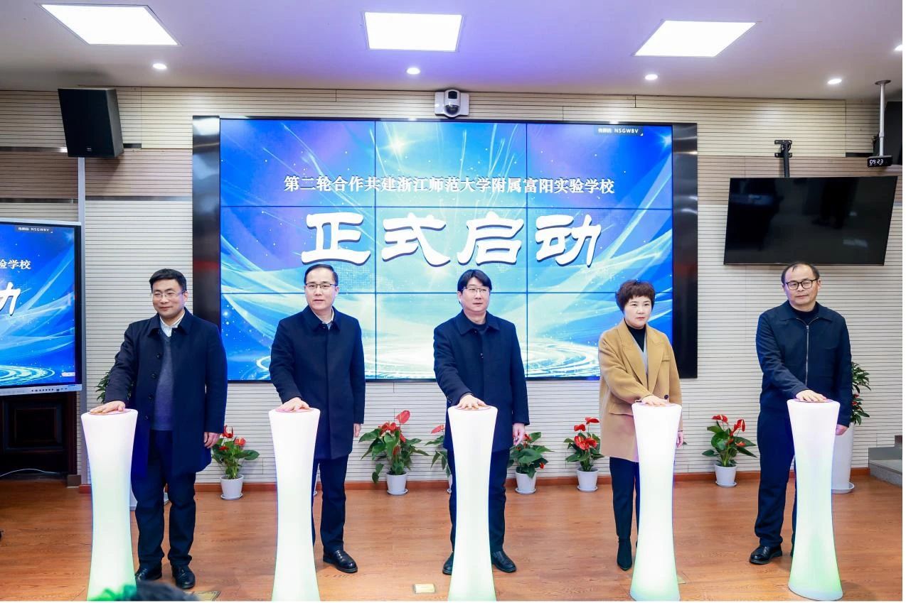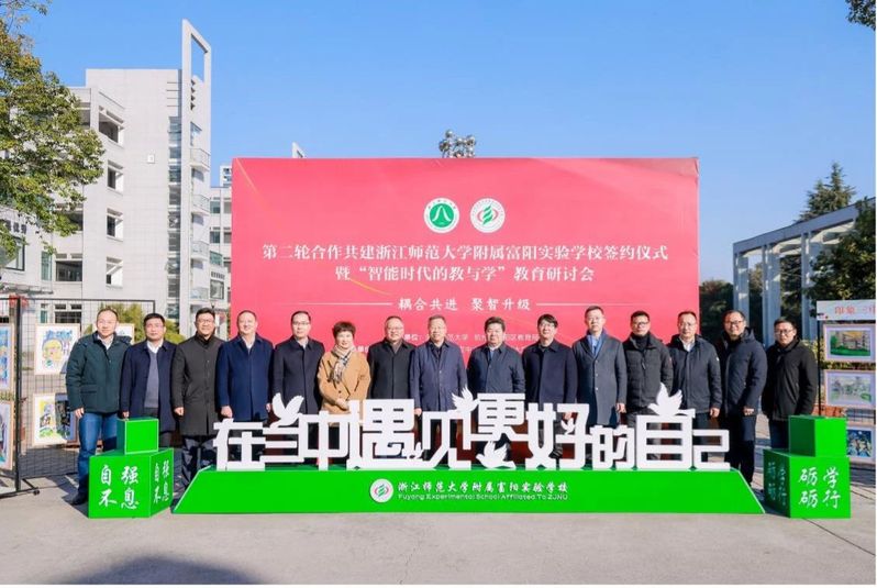 12月29日上午,浙江师范大学附属富阳实验学校第二轮合作共建签约仪式暨“智能时代的教与学”教育研讨会在富阳隆重举行。中国教育学会常务副会长、《中国基础教育》总编辑翟博,中国教育学会副会长、浙江省教育学会会长、浙江省教育厅原副厅长韩平,浙江师范大学副校长兼教育学院院长林一钢,杭州市教育局副局长蒋锋、富阳区教育局局长费国民、富阳区副区长詹艳青,浙江师范大学继教处、教育学院相关负责人等出席。开幕式由费国民主持。