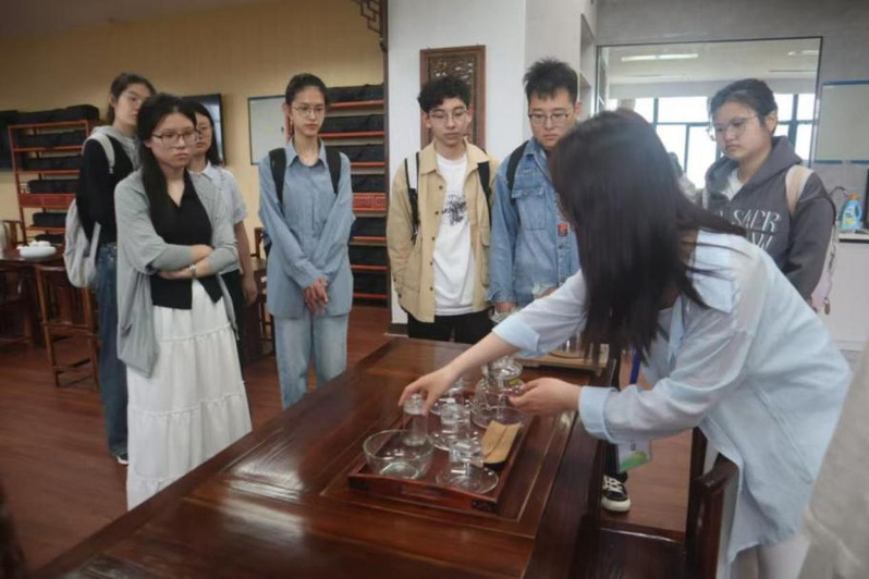 在社会适应实训室的茶艺课堂上,同学们沉浸于袅袅茶香,近距离鉴赏精美茶具,深度领略茶艺课程的独特魅力。实验室创新融合AI技术与传统茶艺,教师进行茶艺展示时,大屏幕上的AI助手同步录制教学过程,并智能生成专业评课报告。这一科技赋能的教学模式,不仅助力同学们课后高效巩固茶艺知识,更让他们沉浸式感受茶文化的深厚底蕴。