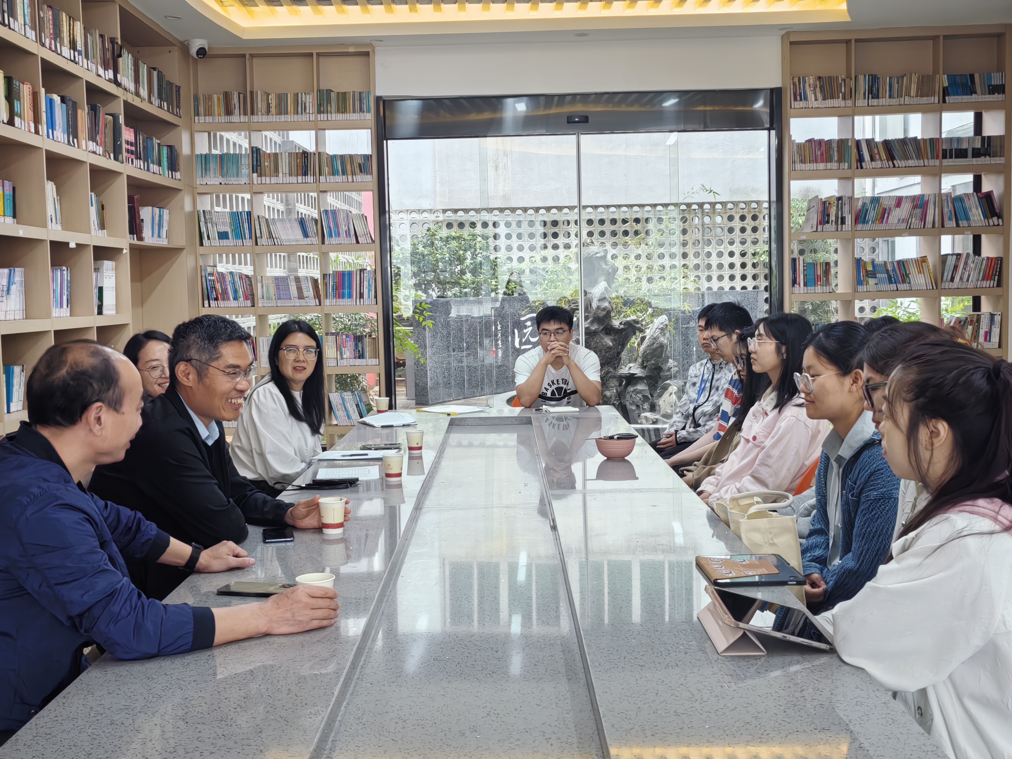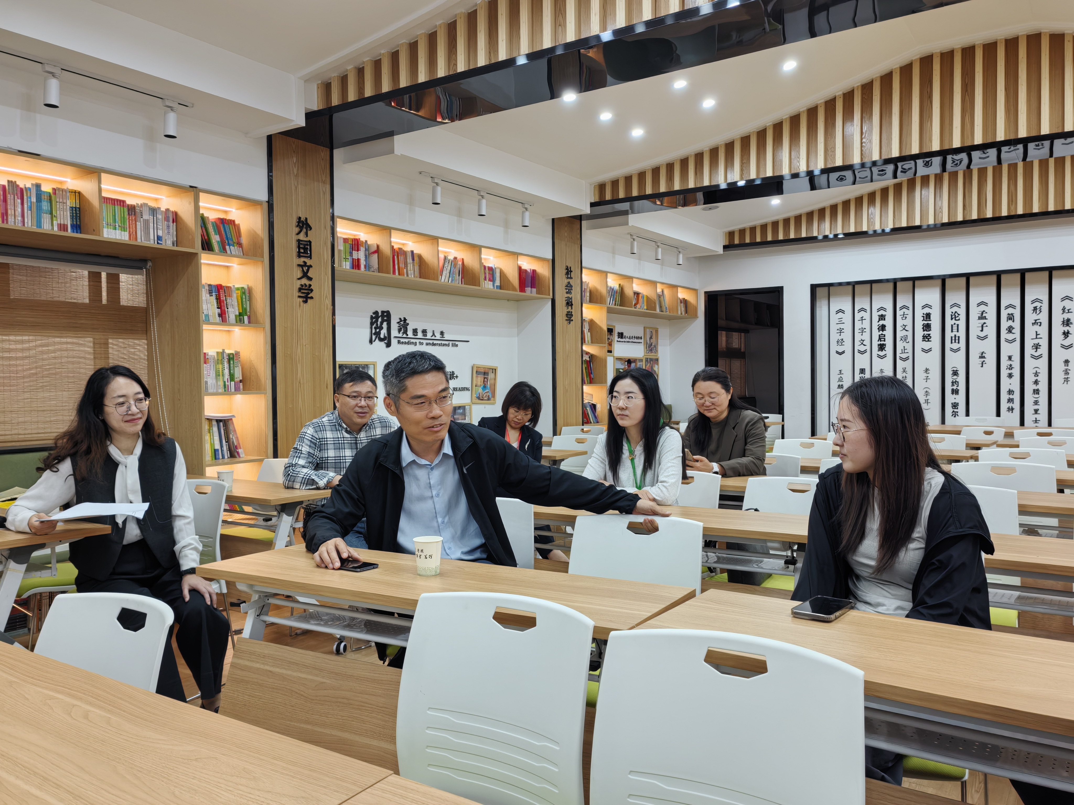 在金华五中实习点,五中副校长张璟、教务主任施锦华和实习生与走访领导在阅览室座谈。张璟副校长对实习生在学校各项事务中的主动参与表示肯定,认为他们在实践中也实现了与学校的双向促进,并以“师姐”的身份表达了对实习生和母校的感谢,也对未来的深入合作表示期待。施锦华主任对这届实习生的综合素质和主动精神给予了充分肯定,并表达了对他们未来职业生涯的殷切期望。