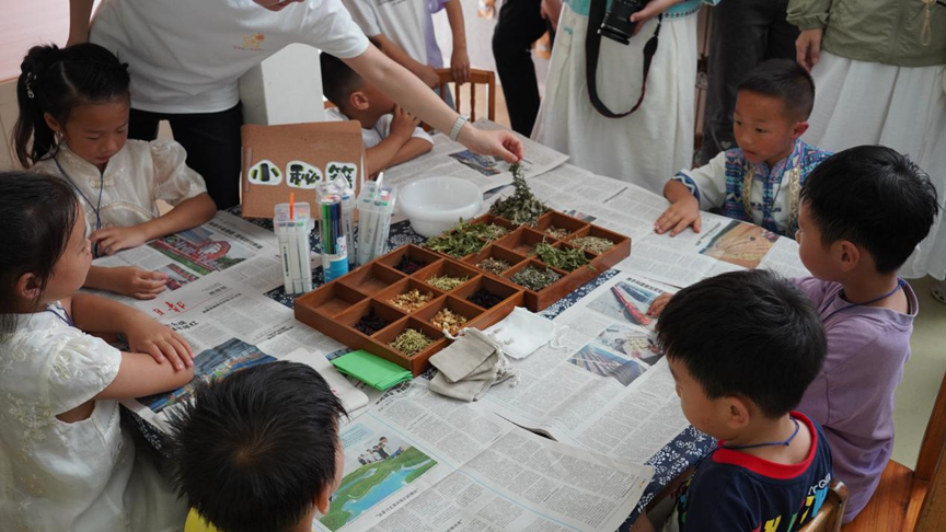 苗韵馆中,一场生动有趣的“草药文化体验课”正欢乐进行。实践队队员们手持香料袋,从香茅草驱蚊提神、薄荷叶解暑散热、艾草祛湿驱寒的功效讲起,把每种香草的妙用清晰地呈现在孩子们面前。蒙眼识香游戏中,小朋友们在气味里辨析草木的独特个性,积极探索香茅草、薄荷叶等草药的功效。研磨草药时,小朋友们亲手操作石杵,石杵起落,香气弥漫。最后,实践队队员们带领小朋友们动手制作养生包。孩子们认真地将研磨好的金银花等材料分拣装袋,并发挥创意,用彩笔在素白的香包上描绘出精美的图案。
