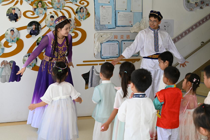 在民舞馆,维吾尔族队员玉孙江·玉苏普和凯丽比努尔·艾沙带领着小朋友们一起学习新疆特色舞蹈,通过生动教学传递民族文化魅力。展示环节,小朋友们与实践队同学携手,用灵动舞姿诠释对民族文化的热爱,更向领导发出热情邀约。当各族身影共舞,欢声笑语回荡,民族团结不再是抽象概念,化作眼前鲜活、温暖的画面,深深印刻在每个人心间。