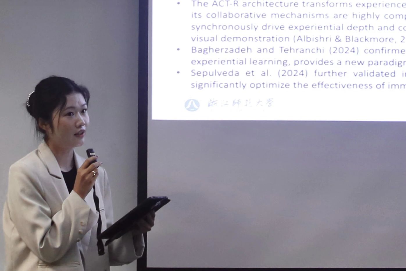 课程结业阶段,各小组围绕“新技术在教育领域的应用”展开了一场精彩的课程展示。同学们结合ICAP理论构建框架,完成教育评估,并针对不同年龄段、不同学科内容搭建起精准的支架式教学(Scaffolding)体系。从Miro到Kahoot,从文学课程到科普知识,多样教学工具的灵活运用,为AI、AR、VR技术落地教育场景提供了兼具创新性与可行性的思路方案。