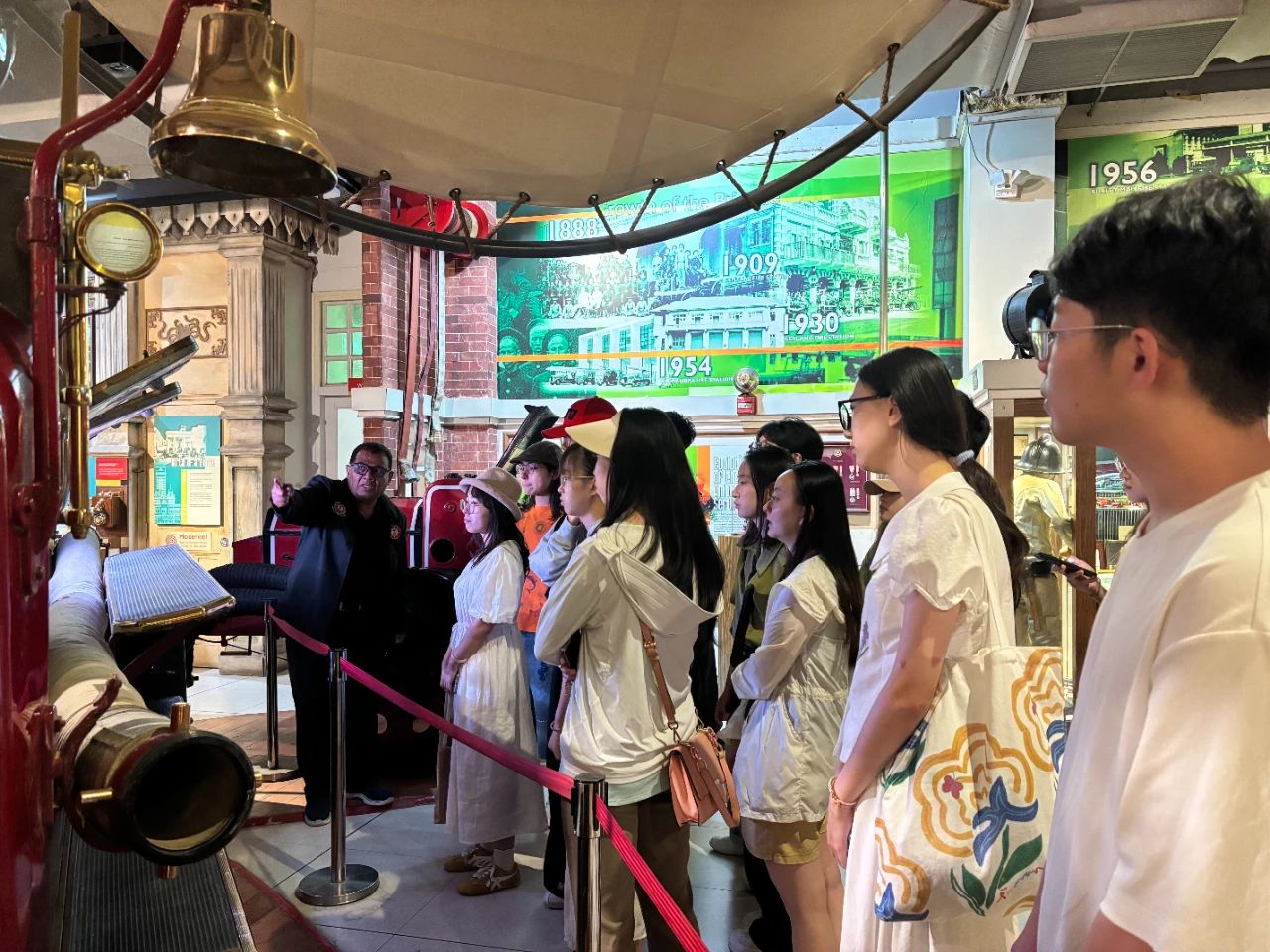 新加坡首批海上消防员罗斯里先生热情接待了敦学访学团。他用丰富的肢体语言,生动讲述了新加坡消防事业的发展历程:消防车从最初的马力驱动,到蒸汽动力,再到如今的高度智能化;消防员从必须光脚出警、从数米高杆滑下,到现在消防车能快速连接各楼层——消防员与民众的生命安全都得到了更好的保障。