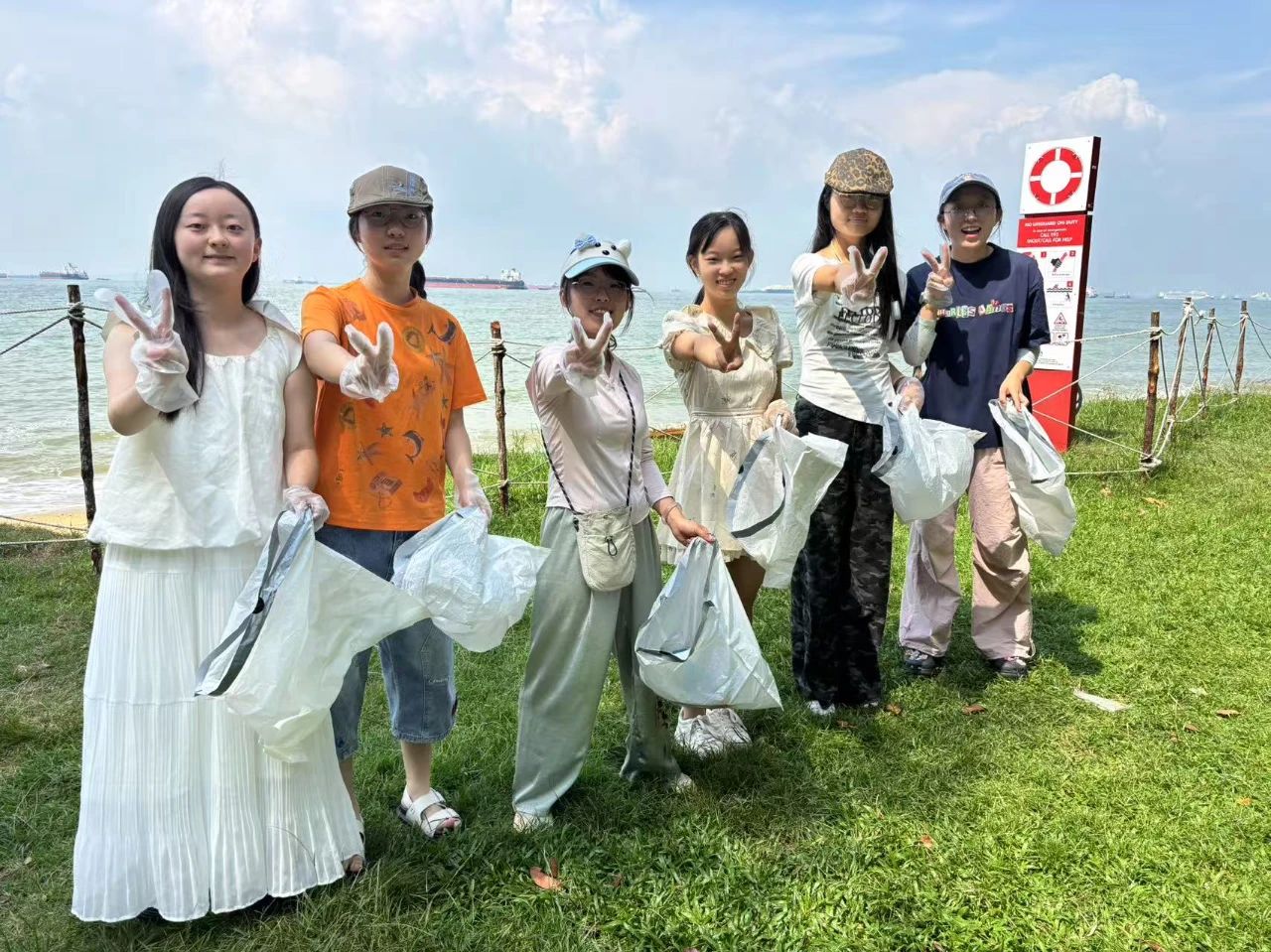 尽管新加坡垃圾管控严格,但是东海岸沙滩因人流密集仍有零星垃圾。8月10日,访学团成员们佩戴好手套、备好垃圾袋,整装出发开展清洁行动。正午烈日灼灼,却丝毫没有动摇同学们清理海滩垃圾的热忱。经过一个小时的专注奋战,同学们沿沙滩分区推进,对塑料碎屑、食品包装等各类垃圾进行了集中清理,用汗水换来了海滩的洁净,也让这段访学记忆因公益之举更添温度。
