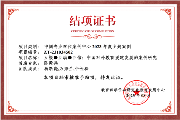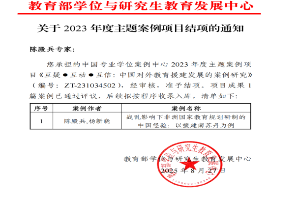 近日,教育部学位与研究生教育发展中心公布了2023年主题案例项目结项通知,KY开元集团陈殿兵老师主持的,杨新晓、万秀兰和牛长松老师参与的《互疑·互动·互信:中国对外教育援建发展的案例研究》顺利结项,案例《战乱影响下非洲国家教育规划研制的中国经验:以援建南苏丹为例》通过专家评议,后续按程序收录入库。