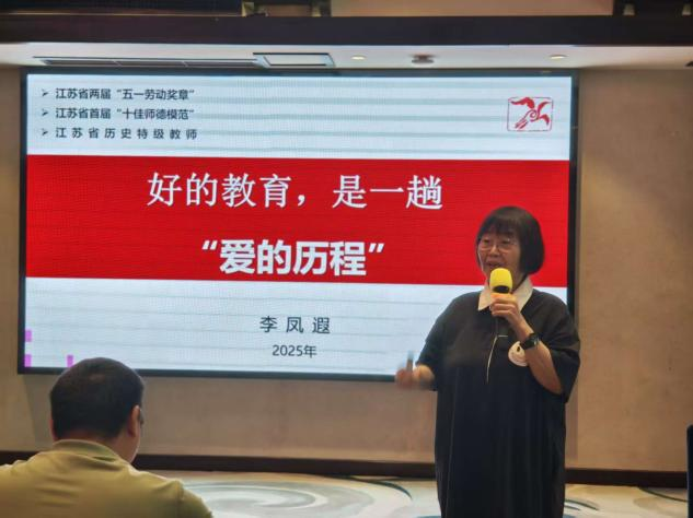 随后,培训开始首场讲座。讲座特邀全国知名班主任、江苏省特级教师、江苏省首届“十佳师德模范”及两届“五一劳动奖章”获得者李凤遐老师,以其深厚的育人智慧为全体参训教师启迪初心、传授经验,助力实战能力提升。李凤遐老师以《好的教育,是一趟“爱的历程”》为题展开精彩分享,她援引德国文学家赫尔曼·黑塞的名言“我们都是为幸福而来”为序,将自己从教近四十年的感悟凝练为“热爱”“会爱”“被爱”三个核心维度,为在场新教师们解读教育与幸福的真谛。她强调,对教育的“热爱”是坚守的初心,懂方法的“会爱”是育人的智慧,学生回馈的“被爱”是教师最珍贵的勋章,唯有守住这三重“爱”,才能在教育之路上走得坚定、走得温暖、走得长久。