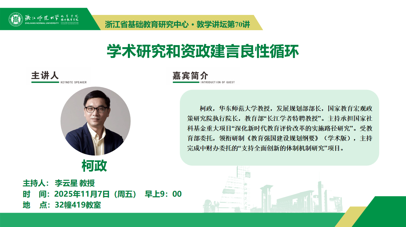 2025年11月7日(周五)上午9:00,华东师范大学教授、发展规划部部长、国家教育宏观政策研究院执行院长、教育部“长江学者特聘教授”柯政教授将于32幢419教室,主讲浙江省基础教育研究中心系列讲座暨教育学院敦学讲坛第70讲《学术研究和资政建言良性循环》,欢迎广大师生踊跃参加!