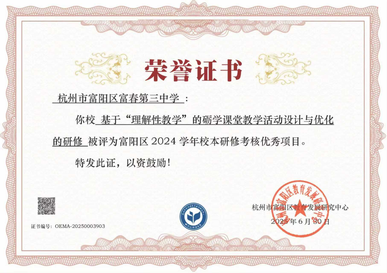 富阳区教育发展研究中心对全区148所学校校本研修工作开展考核评选,浙师大附属富阳实验学校《基于“理解性教学”的砺学课堂教学活动设计与优化的研修》项目获评“优秀”。