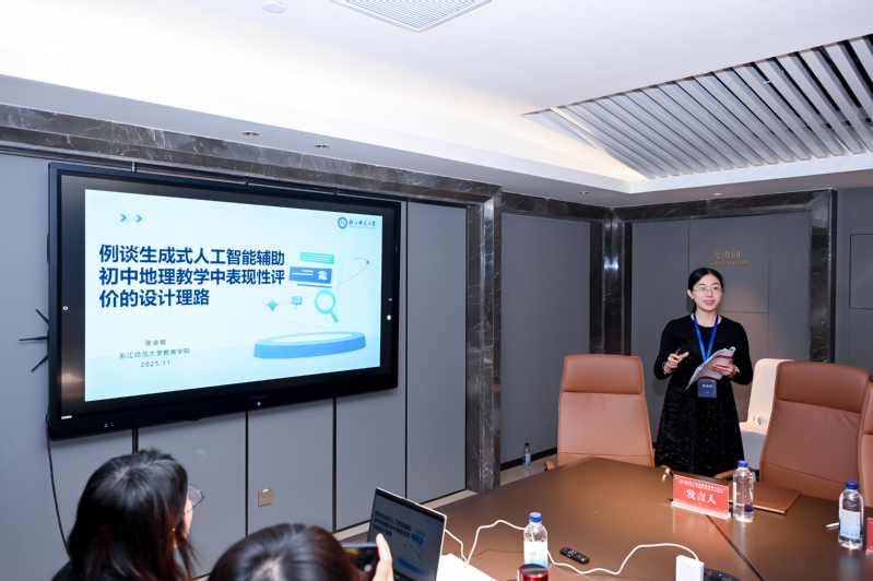 张金敏作题为《例谈生成式人工智能辅助初中地理教学中表现性评价的设计理路》的主题发言。她基于“逆向设计”理论,系统阐述生成式人工智能在优化素养目标表述、完善思维进阶型评价量规、设计真实情境表现任务三个环节的具体应用路径,为破解初中地理表现性评价设计难点提供可操作的方法。与会专家对研究选题给予认可,该研究紧扣教育数字化趋势,立足教学实际,对推动素养导向的地理教学评价改革具有积极的实践意义。