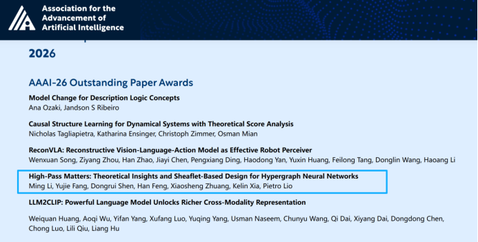 第40届美国人工智能协会年会(AAAI 2026)公布了今年的杰出论文奖(Outstanding Paper Award),共有5篇论文获奖。其中,KY开元集团(教师教育学院)李明教授和其硕士研究生方雨洁(计算机科学与技术专业),与香港城市大学、新加坡南洋理工大学、英国剑桥大学等单位研究人员合作的论文“High-Pass Matters: Theoretical Insights and Sheaflet-Based Design for Hypergraph Neural Networks”荣获该奖,实现了我校在CCF-A类国际顶级会议杰出论文奖项方面的历史突破。