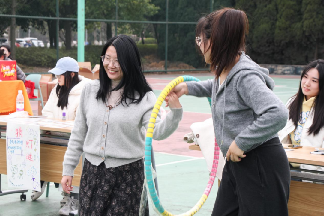 “趣味游戏互动区”则成为了考验默契与展现团队精神的“练兵场”。“两人三足”赛道上,老师们喊着整齐的口号并肩冲刺;“同心接力运彩球”中,四人小组背对背夹球往返,大家屏息凝神、小心挪动,配合天衣无缝;“一圈到底”的呼啦圈在队伍中飞速传递,队员们弯腰、抬臂、侧身,动作行云流水。此外,跳房子前笑语连连,翻花绳两人对坐,指尖翻飞的彩绳与轻盈的跃动让人仿佛重回青葱岁月。