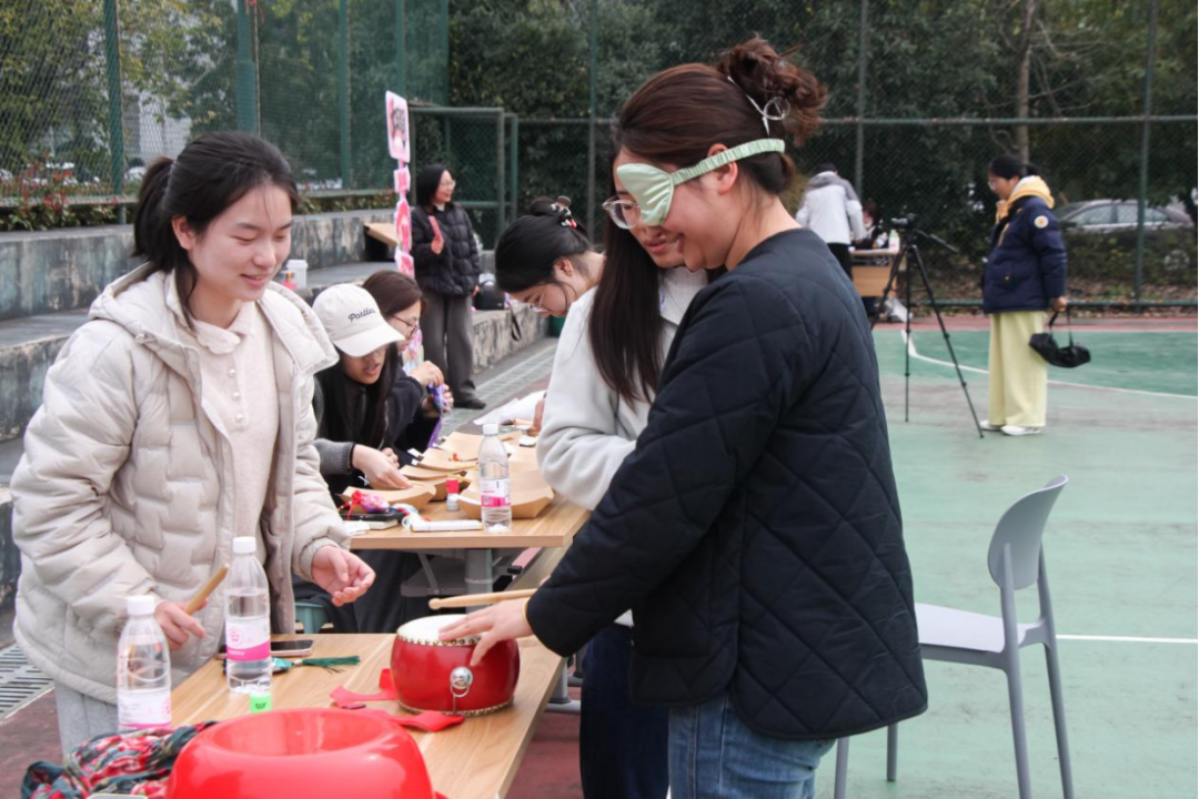 在巧手工坊内,中药香囊制作区香气袅袅。女教职工们将艾草、薄荷等药材细致地缝入布囊,一针一线间传递着对健康与幸福的美好祈愿。知识灯谜会前人头攒动,大家或凝神思索,或热烈讨论,猜中者的欢呼声此起彼伏。不远处的“盲人击鼓”与“欢乐投靶”环节同样充满欢声笑语,蒙眼转圈后的踉跄步伐,以及沙包精准落靶的瞬间喝彩,让整个场地洋溢着轻松愉悦的节日氛围。