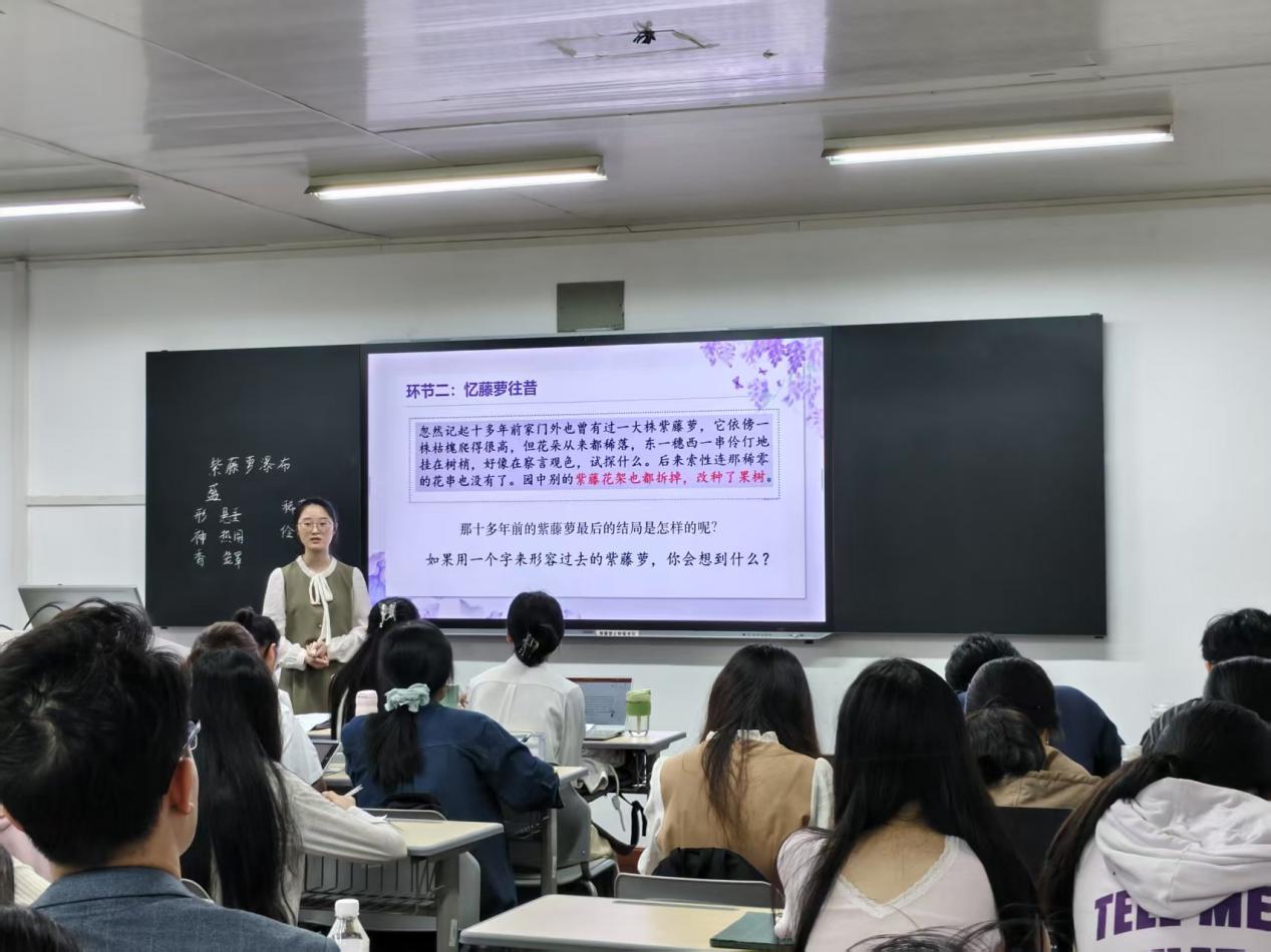在公开课展示环节,学科教学(语文)专业研究生以“课文解读与教材处理的理论与实践”为主题,现场讲授《紫藤萝瀑布》经典课文。授课通过启发式提问、自主研读、齐声朗诵等多维互动,生动诠释了新课标理念下的课堂教学艺术。在小组互评环节,各小组从教态仪表、课程导入、板书设计等维度展开专业评课,郑逸农老师结合教师形象塑造、语言艺术、教材处理策略及学科核心素养培养等方面进行了深度点评。