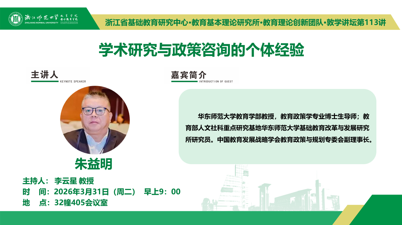 3月31日(周二)上午9:00,华东师范大学教育学部教授、教育政策学专业博士生导师、教育部人文社科重点研究基地华东师范大学基础教育改革与发展研究所研究员朱益明将在32幢405会议室,主讲浙江省基础教育研究中心、教育基本理论研究所、教育理论创新团队系列讲座暨敦学讲坛第113讲《学术研究与政策咨询的个体经验》。主持人为李云星教授。